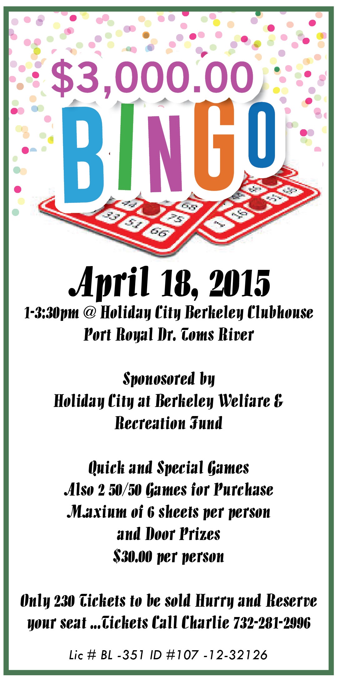$3,000 Bingo 1-3:30 pm HCB Clubhouse